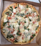 White pizza, fresh garlic, tomatoes, spinach, ricotta cheese, and mozzarella.